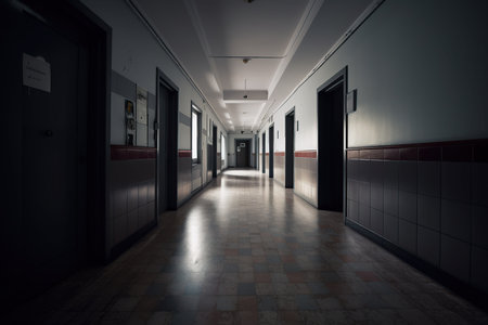 A long, empty hospital corridor with closed doors on both sides, illuminated by overhead fluorescent lights.