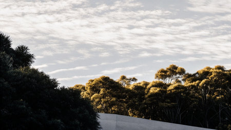 Eucalyptus trees in a row against a cloudy sky