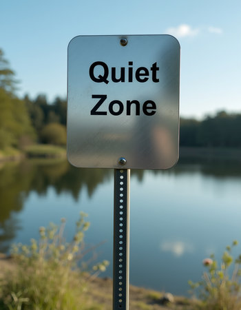 Tranquil Quiet Zone sign by peaceful lake with reflections