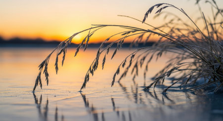 A tranquil winter morning with frosted reeds glistening under a soft sunrise in a serene landscape