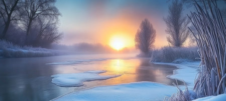 Beautiful Frozen Winter Landscape at Sunrise with Misty River and Snowy Reeds Reflecting Light