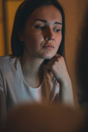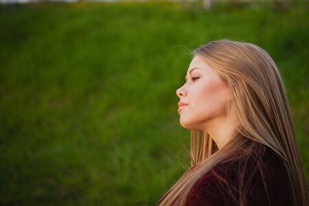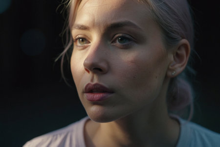 Close up Young woman with soft sunset, contrasting colors, dynamic lighting on digital art concept.