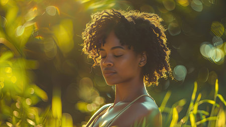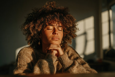 Woman with curly hair is meditating in a cozy sweater, bathed in warm sunlight, creating a tranquil ambiance with soft shadows and gentle light