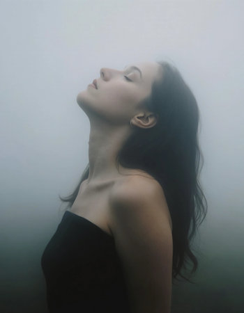 This artistic portrait captures a serene female profile, illuminated by soft light, emphasizing delicate facial features and an elegant expression.