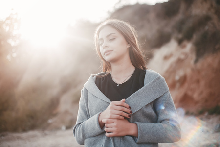 Young girl, wearing casual clothes, photographed on the beach in winter.