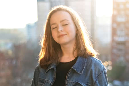 A woman stands outside with her eyes closed and a slight smile on her face. She seems to be enjoying the fresh air and sunlight in a natural setting. Her hair flows in the wind.