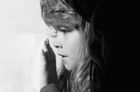 A close-up profile portrait of a young woman looking down with a pensive or sad expression. Backlit by natural window light, the image conveys moodiness, deep thought, or melancholy.