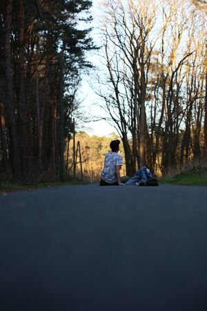 confident young man sitting in the woods