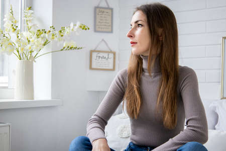 Portrait of a young pensive woman sitting by the window. Close-up.