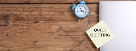 quote 'Quiet quitting' on yellow sticker on computer with clock and notebook. work life balance concept. post covid life philosophy. banner