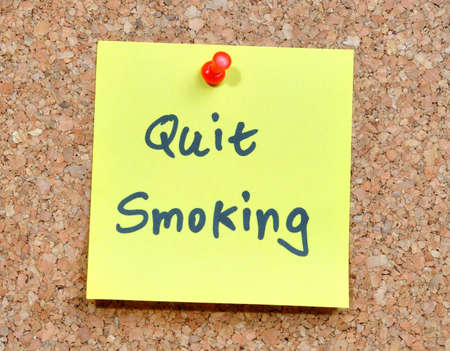 Stop Smoking - Quit Now - with cigarettes and ashtray on red and white background