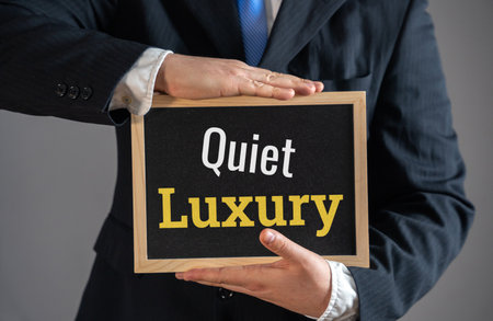 A businessman holds a sign Quiet Luxury. High-end minimalism. Refined wealth, exclusive branding, and premium lifestyle choices. Don't give the appearance of being ultra-rich. Modesty and practicality