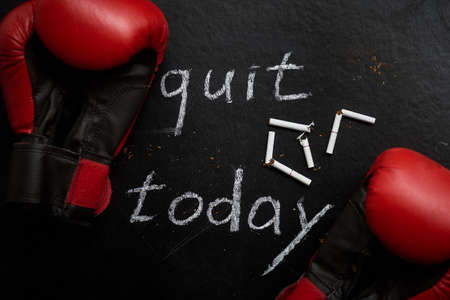 Stop smoking concept. Broken cigarettes and boxing gloves with the words -Quit today on a black background.
