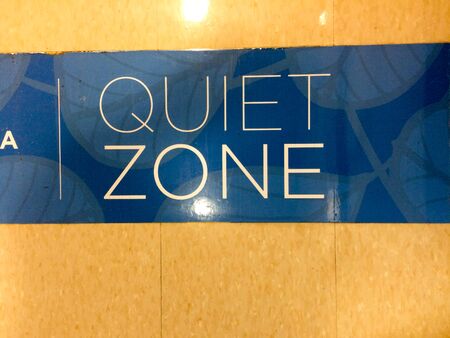 Sign indicating a quiet zone in a long corridor with doors and lights, promoting peace and tranquility