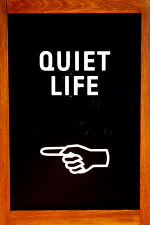 Human hand pointing in the direction of Quiet life saying isolated on black board with wooden frame.
