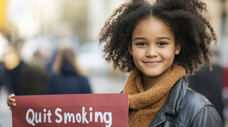 Amidst the lively city backdrop, a determined young person holds a Quit Smoking banner, passionately advocating for a healthier lifestyle during a public awareness campaign.