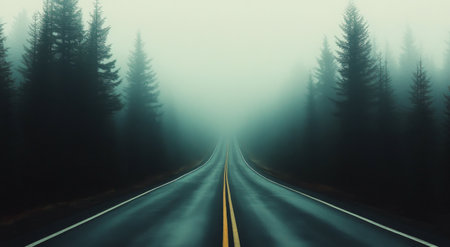 Empty road disappearing into heavy fog, eerie and mysterious vibe, minimal color, cinematic framing
