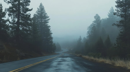 A winding road leads through a dense forest shrouded in fog during the early morning hours, creating an atmosphere of tranquility and mystery.