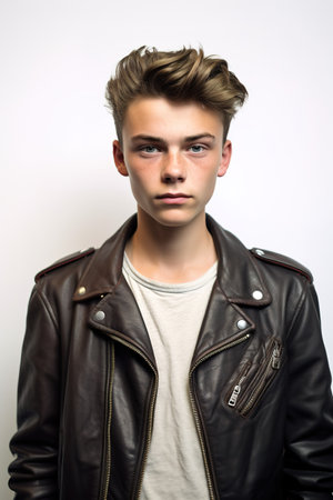 Portrait of a handsome young man in a leather jacket on a white background