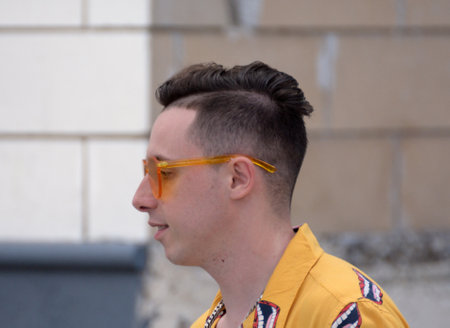 Portrait of a handsome young man with trendy hairstyle. Men's beauty, fashion.