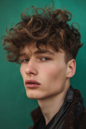 Close-up of a young man with a trendy messy textured crop haircut against a green backdrop
