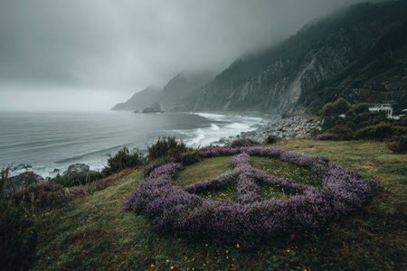 Vibrant purple flower peace symbol in a coastal setting, surrounded by cliffs and ocean waves, creating a serene atmosphere and showing natural beauty