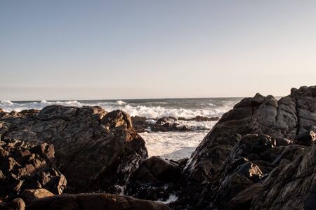 View of the pacific ocean with rocky shore on the foreground in Chile