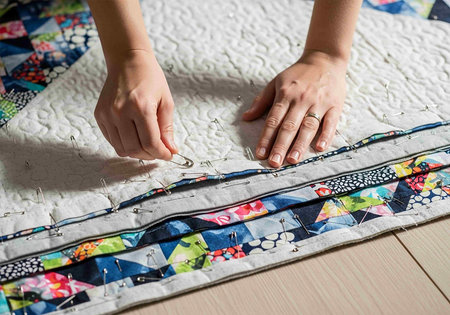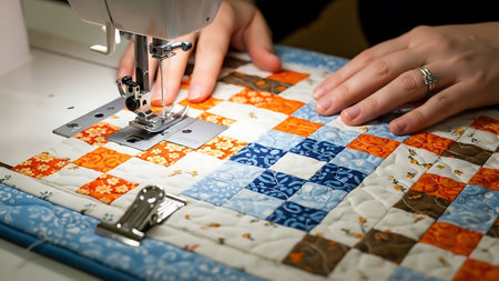 A close-up view of hands expertly crafting a vibrant quilt, showcasing the intricate patterns and textures. The scene captures the warmth and dedication of quilting.