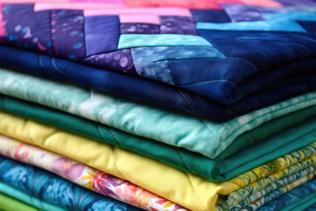 Colorful quilted fabric with vibrant patchwork design and detailed stitching
