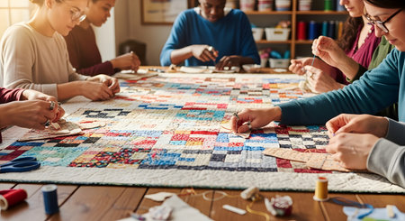 A diverse group of women sits around a large table, working together to hand-stitch a colorful patchwork quilt. This image captures a sense of community, collaboration, tradition, and the shared hobby of crafting.