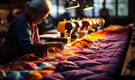 Women hand sewing colorful quilt with intricate patterns independent woman side hustle High resolution AI generated