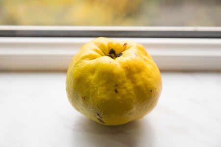 Ripe whole quince and sweet jam from it. Fresh fruit, an essential ingredient for a healthy diet, dessert in a glass jar. Trendy hard light, dark shadow. White wooden background, close up
