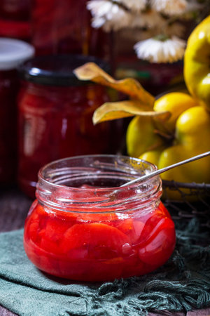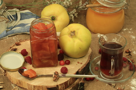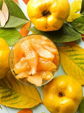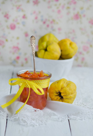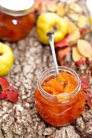 Apple quince jam. Sweet autumn homemade quince jam or marmalade canning preserves in a jar, with whole and cut apple quinces in the background