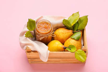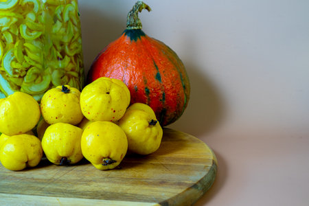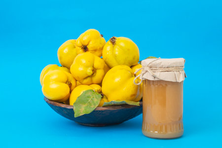 Quince fruit pile in a wooden bowl, with a jam jar without a label, soft focus close up isolated on blue background
