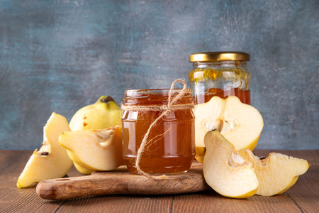 Homemade quince jelly and fruits on wooden background. Sweet food