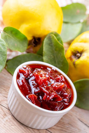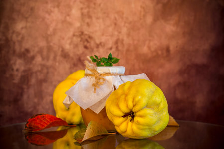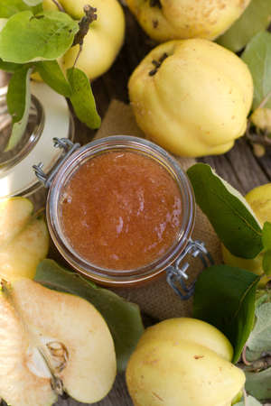 Homemade quince jam in a glass jar on an old wooden background. Fresh quince fruits and leaves and quince jam.