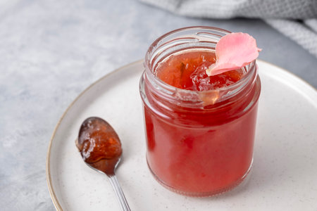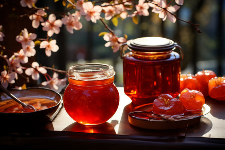 Glass jar of freshly handmade fruits jam in natural sunlight for a delicious morning treat
