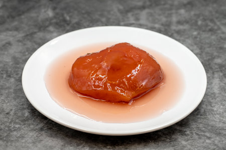 Quince dessert with syrup on a dark background. Traditional Mediterranean cuisine delicacies. Turkish Ramadan dessert. Horizontal view. close up