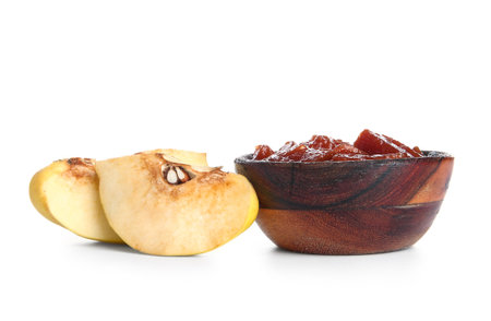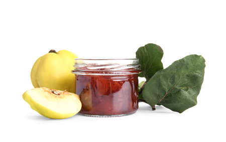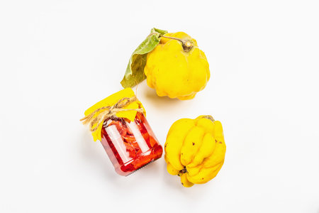 Ripe whole quince and sweet jam from it isolated on white background. Fresh fruit, an essential ingredient for a healthy diet, dessert in a glass jar