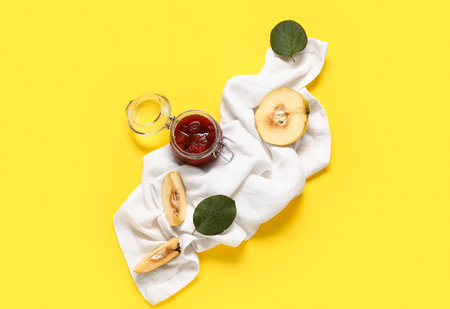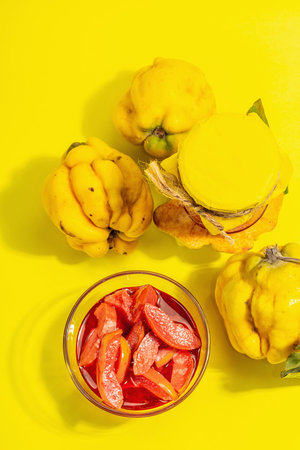 Ripe whole quince and sweet jam from it isolated on yellow background. Fresh fruit, an essential ingredient for a healthy diet, dessert in a glass jar. Trendy hard light, dark shadow, top view