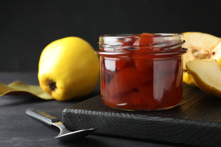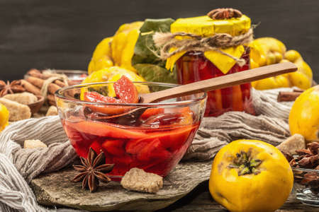 Ripe quince fruits with jam in a glass jar on a dark wooden table. Autumn recipes.