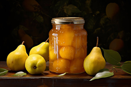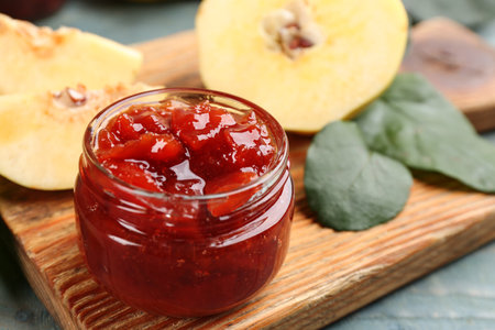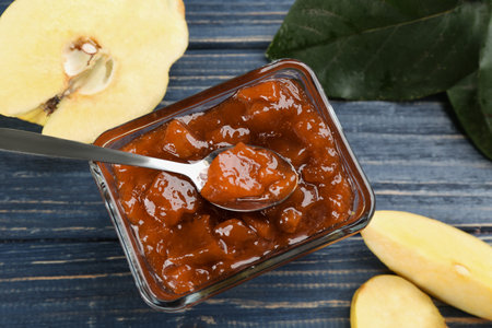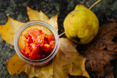 caramelized quince in a jar on a leaf, quince fruit and spoon