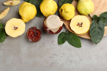 Delicious quince jam, fruits and leaves on gray wooden table, flat lay. Space for text