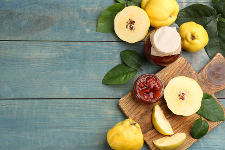 Delicious quince jam and fruits on light blue wooden table, flat lay. Space for text