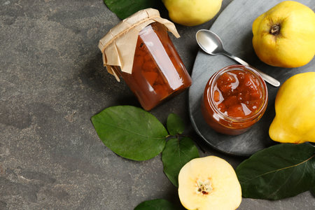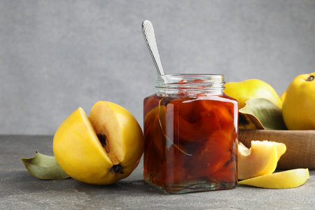 Tasty homemade quince jam in jar, spoon and fruits on gray textured table
