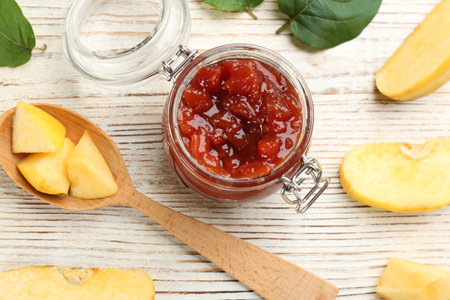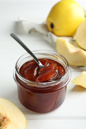Tasty homemade quince jam in jar, spoon and fruits on white wooden table