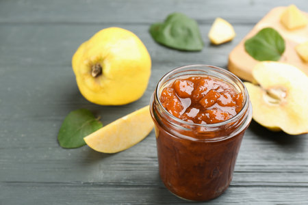 Delicious quince jam and fruits on gray wooden table. Space for text