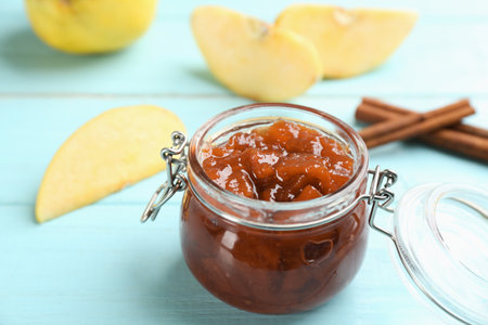 Delicious quince jam, fruits and cinnamon on light blue wooden table