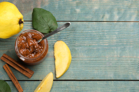 Delicious quince jam, fruits and cinnamon on blue wooden table, flat lay. Space for text