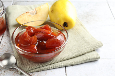 Tasty homemade quince jam in bowl and fruits on tiled table, closeup. Space for text